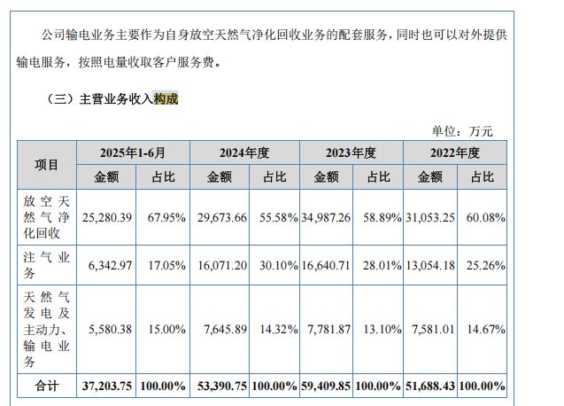 凯龙洁能主营油气田放空天然气净化回收、注气业务及天然气发电服务等,其中放空天然气净化回收业务收入占比常年超过50%,是绝对的核心支柱。