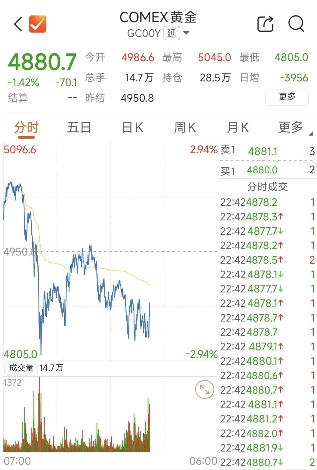 COMEX 黄金盘中跌近3%,截至发稿有所回升。