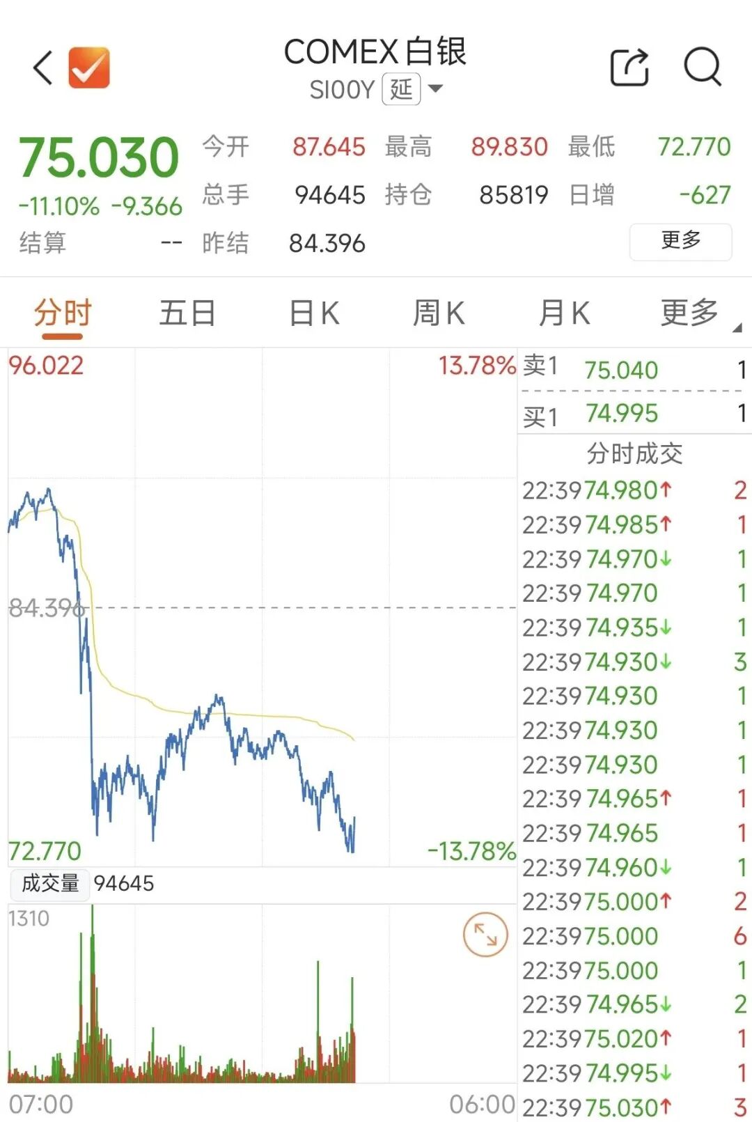 2月5日晚间,外盘贵金属期货走弱,COMEX 白银盘中跌幅超13%。