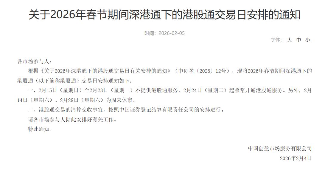沪深港通方面,2月15日(星期日)至2月23日(星期一)不提供港股通服务,2月24日(星期二)起照常开通港股通服务。另外,2月14日(星期六)、2月28日(星期六)为周末休市。