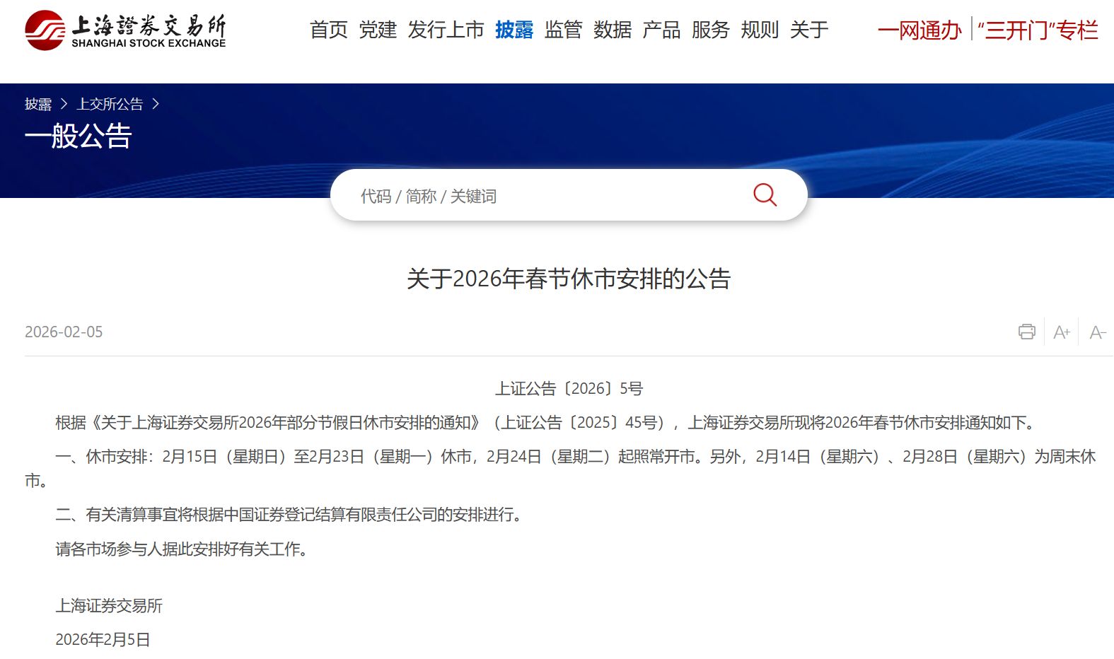 2月5日,沪深北交易所均公布了2026年春节休市安排: