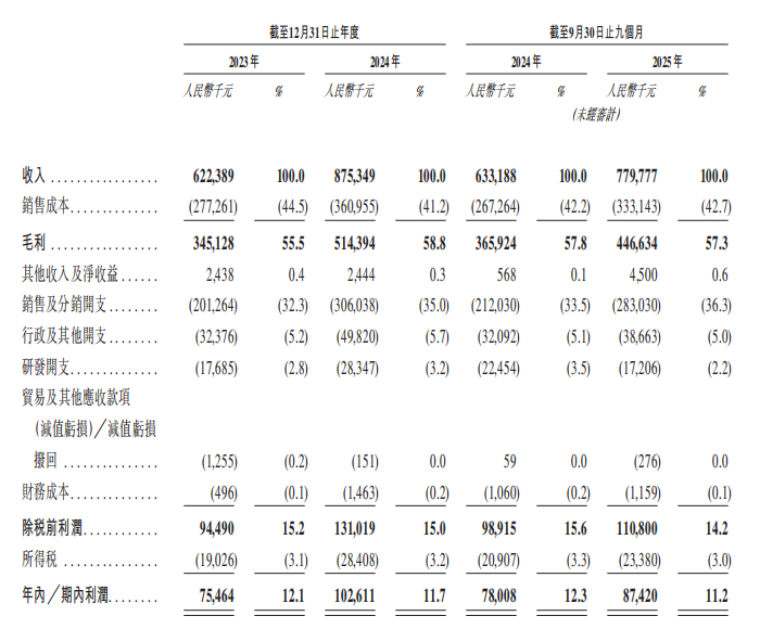 数据显示,2023年至2025年前三季度,公司营收从6.22亿元增长至7.80亿元,毛利率始终维持在55%以上。但高毛利并未顺利转化为高净利。同期,公司净利率从12.2%下滑至11.2%。