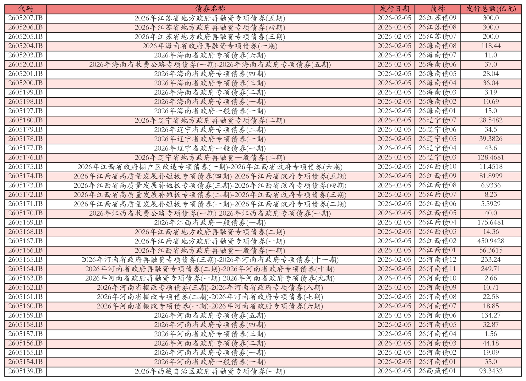 南财智讯2月5日电,盘后数据显示,2026年2月5日全国共发行39只地方政府债,共计3083.3827亿元。其中,政府一般专项债发行6只,共454.0777亿元;地方政府专项债发行33只,共2629.305亿元。各地方政府所发行债券中,26江苏债09、26江西债02、26河南债11、26海南债08、26西藏债01、26辽宁债03发行规模靠前,发行金额分别为300.0亿元、450.9428亿元、249.71亿元、118.44亿元、93.3432亿元、128.4681亿元。投标方面,各地方政府所发行债券中,26江苏债09、26江西债02、26河南债11、26海南债08、26西藏债01、26辽宁债03全场中标倍数靠前。其中:26江苏债09全场中标倍数为15.84,全场中标利率为2.46%,边际倍数为1.99;26江西债02全场中标倍数为20.02,全场中标利率为2.01%,边际倍数为3.55;26河南债11全场中标倍数为19.63,全场中标利率为2.47%,边际倍数为16.68;26海南债08全场中标倍数为17.46,全场中标利率为1.97%,边际倍数为1.09;26西藏债01全场中标倍数为24.18,全场中标利率为2.51%,边际倍数为1.56;26辽宁债03全场中标倍数为28.06,全场中标利率为1.79%,边际倍数为1.47。今日发行地方政府债详情如下表: