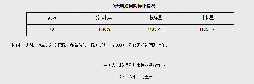 中新网2月5日电据央行网站消息,2026年2月5日,中国人民银行以固定利率、数量招标方式开展了1185亿元7天期逆回购操作。