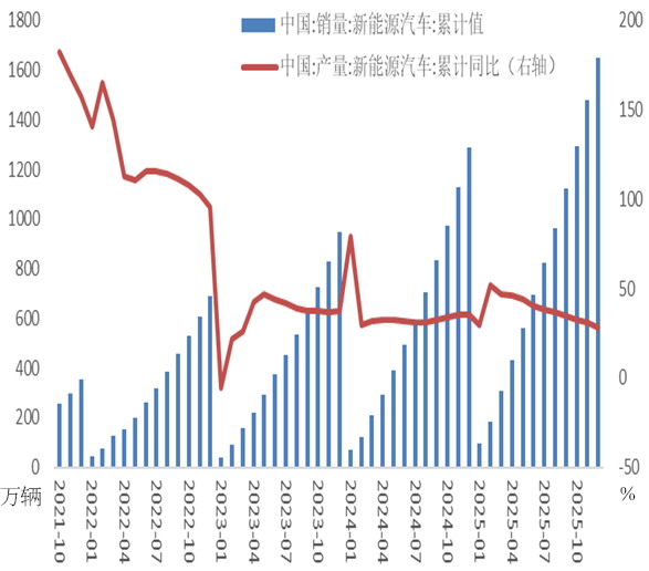 需求方面,受“以旧换新”政策提振,2025年新能源汽车市场表现良好,对碳酸锂消费有一定支撑。2025年12月,新能源汽车产销分别完成171.8万辆和171万辆,同比分别增长12.3%和7.2%。2025年1—12月,新能源汽车产销分别完成1662.6万辆和1649万辆,同比分别增长29%和28.2%。
