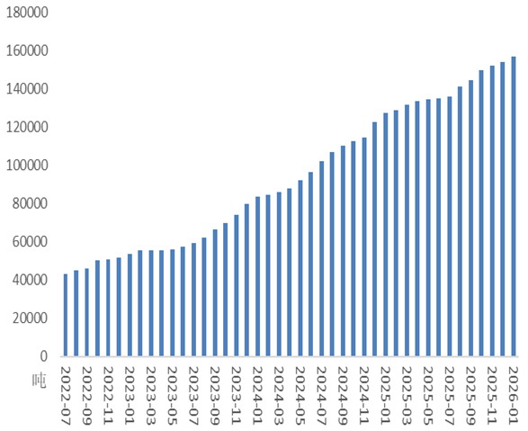 2025年12月碳酸锂冶炼总产能为153980吨,同比增长25.79%,开工率为58%。