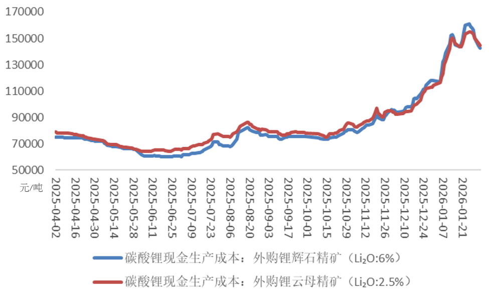 原材料方面,由于国内对采矿权的审批愈发严格,且海外矿山发货量减少,从2025年6月开始,锂矿石价格稳步回升。截至1月30日,进口锂辉石价格为2070美元/吨,上年同期为845美元/吨;国产锂云母价格为3240元/吨,上年同期为1230元/吨。