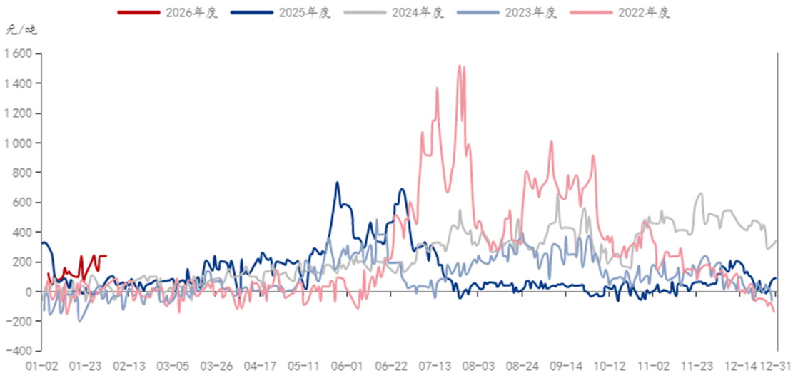 尽管需求边际转弱,但当前苯乙烯供需依然偏紧。据隆众资讯统计,苯乙烯港口商业库存仍处于历史同期低位。更重要的是,现货市场供应紧张直接体现在强劲的基差上。当前苯乙烯基差为237元/吨,处于近年同期高位,这意味着期货价格难以大幅下跌。