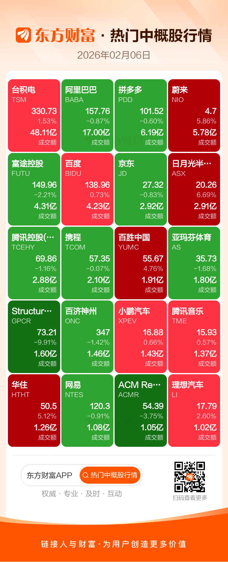 台积电涨1.53%,阿里巴巴跌0.87%,拼多多跌0.60%,蔚来涨5.86%,富途控股跌2.21%,百度涨0.73%,京东跌0.83%,日月光半导体涨6.69%,腾讯控股(ADR)跌1.16%,携程跌0.07%。
