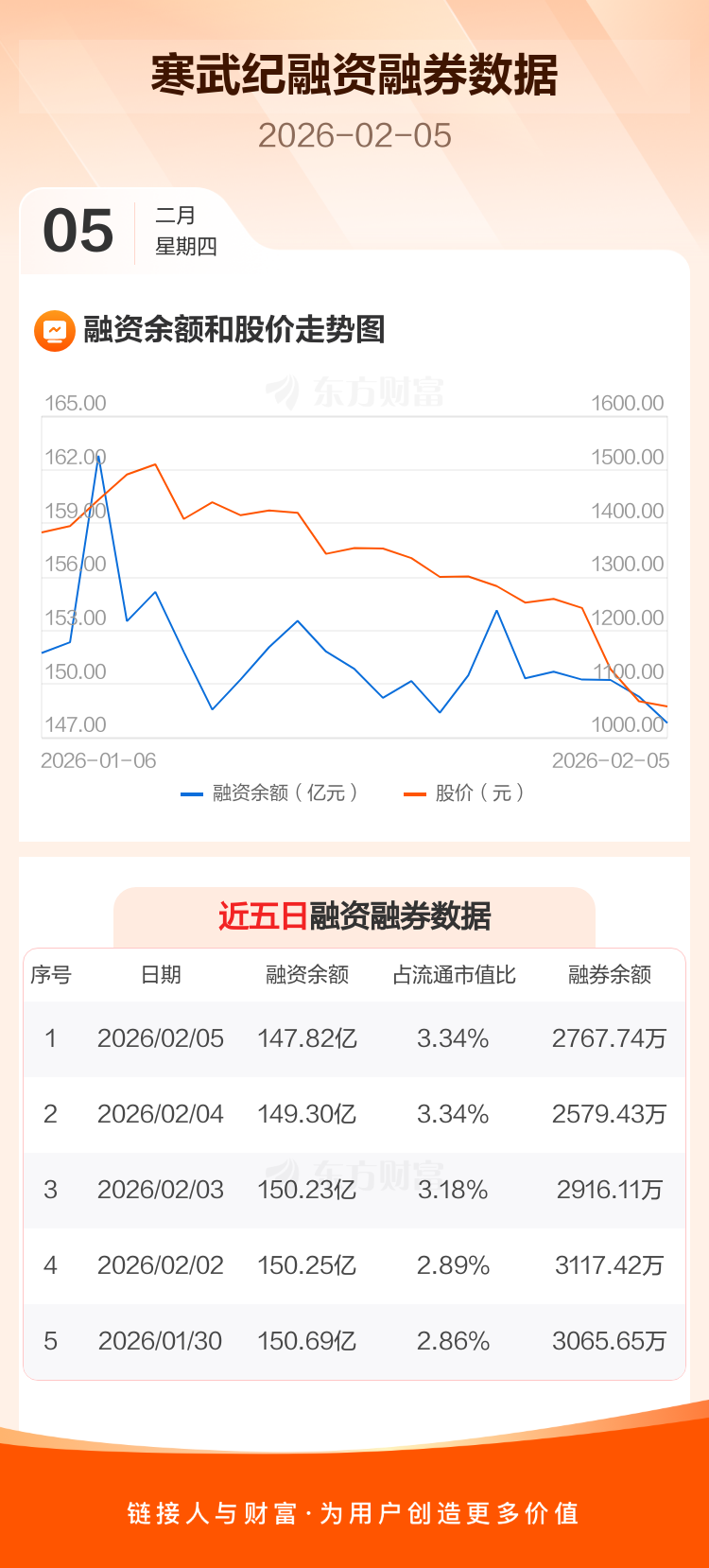 交易所最新数据显示,寒武纪于2026年2月5日获融资买入7.78亿元,融资偿还9.27亿元,当日融资净偿还1.48亿元。目前,该股融资余额147.82亿,占流通市值比例为3.34%。