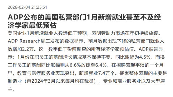 美国1月ADP新增就业岗位2.2万个,远低于市场预期4.8万人,前值由4.1万下修至3.7万。美国劳工统计局(BLS)宣布,将于2月11日发布1月非农就业报告,将于2月5日发布职位空缺数据,重新安排2月13日发布1月CPI。