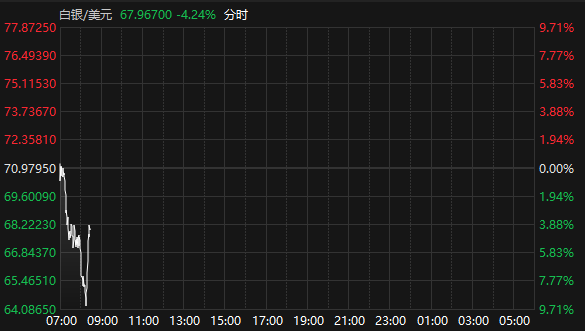 上证报中国证券网讯据Choice数据,2月6日,国际现货黄金、白银早盘延续跌势,截至8:27现货黄金4721.12美元/盎司,日内跌1.24%,此前一度失守4700美元/盎司关口;现货白银报67.97美元/盎司,日内跌4.24%。
