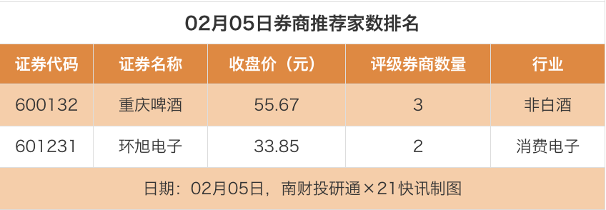 从券商推荐家数来看,2月5日有21家上市公司得到券商推荐,其中重庆啤酒获得3家推荐,环旭电子获得2家推荐,大唐发电获得1家推荐。