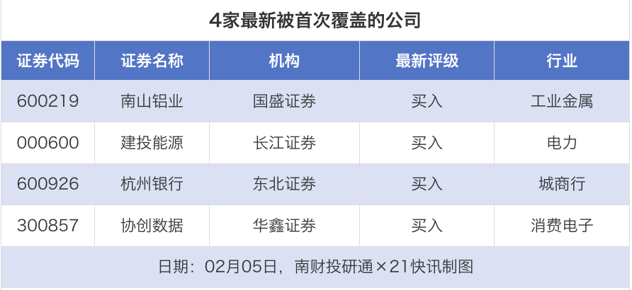 首次覆盖方面,2月5日券商共给出了4次首次覆盖,其中南山铝业获得国盛证券给予“买入”评级,建投能源获得长江证券给予“买入”评级,杭州银行获得东北证券给予“买入”评级,协创数据获得华鑫证券给予“买入”评级。