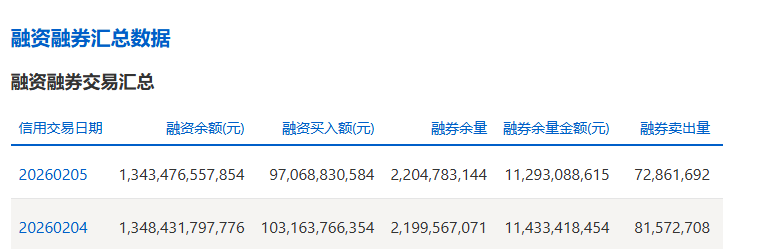上证报中国证券网讯截至2月5日,上交所融资余额报13434.77亿元,较前一交易日减少49.55亿元;深交所融资余额报13119.17亿元,较前一交易日减少68.02亿元;两市合计26553.94亿元,较前一交易日减少117.57亿元。