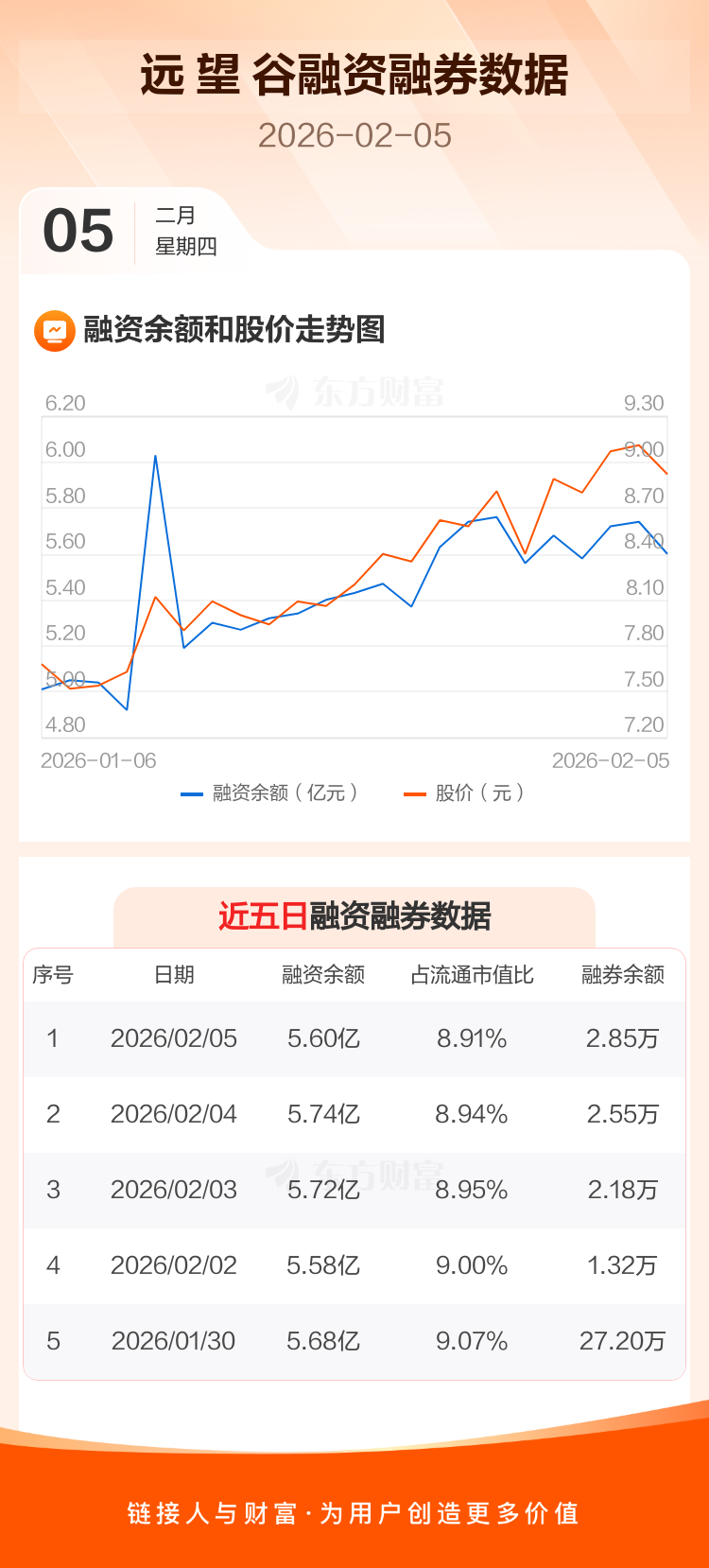 交易所最新数据显示,远 望 谷于2026年2月5日获融资买入2214.82万元,融资偿还3609.55万元,当日融资净偿还1394.73万元。目前,该股融资余额5.60亿,占流通市值比例为8.91%。