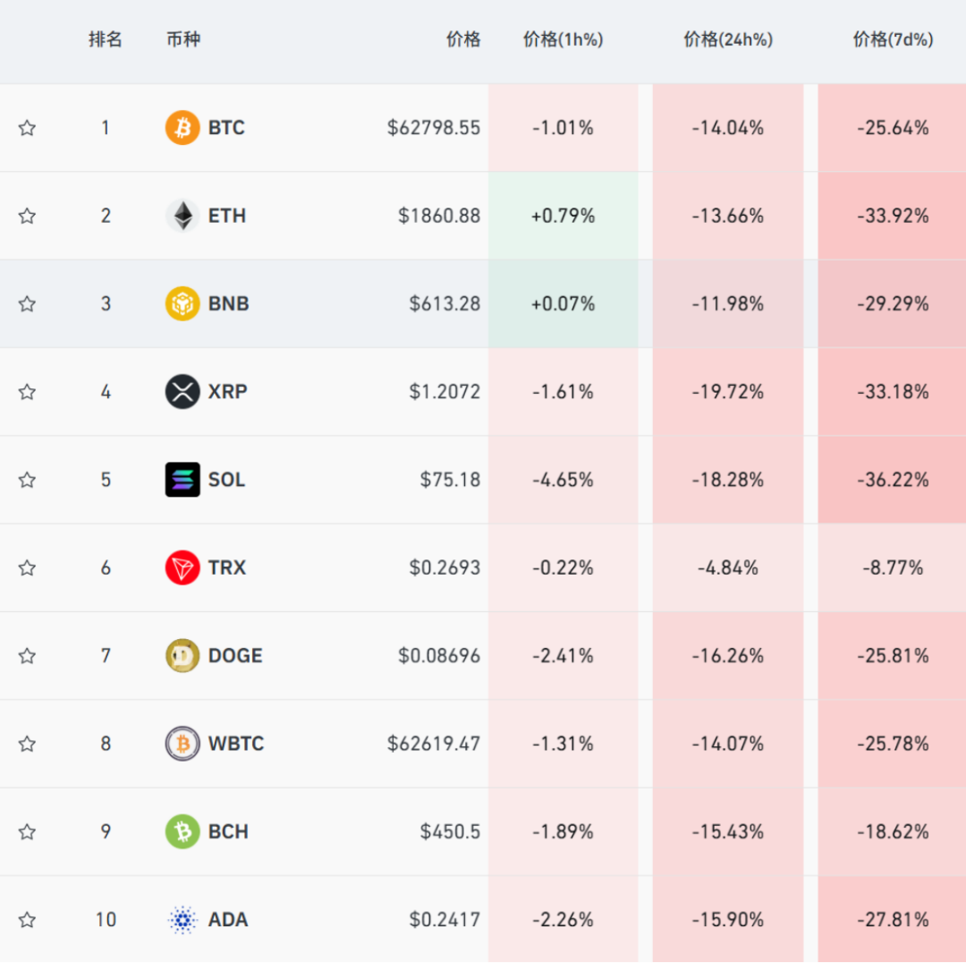 过去24小时,主流加密货币集体暴跌,比特币、以太坊、狗狗币、艾达币等跌幅均超10%。