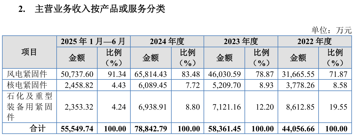 风电紧固件收入占比随之从2022年的71.87%攀升至2025年上半年的91.34%。公司提示,虽然风电行业长期受益于碳中和目标,但短期内若市场电价持续低位或政策执行力度放缓,下游投资意愿可能减弱,需求回落将直接冲击公司订单规模和业绩稳定性。