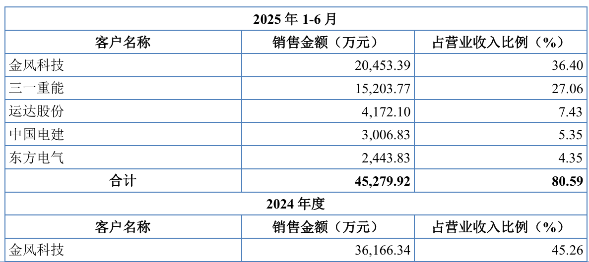 报告期内,定西高强前五大客户销售占比从60.36%升至80.59%,金风科技(002202/02208)长期为第一大客户,销售占比保持在36%以上;2025年上半年,金风科技与三一重能(688349)合计贡献约63%的营收。