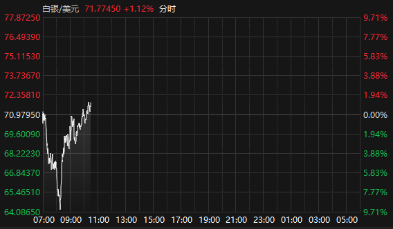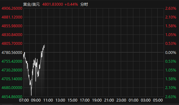 上证报中国证券网讯据Choice数据,2月6日,国际现货黄金站上4800美元/盎司关口,截至10:28报4801.83美元/盎司,日内涨0.44%;现货白银报71.77美元/盎司,日内涨1.12%。