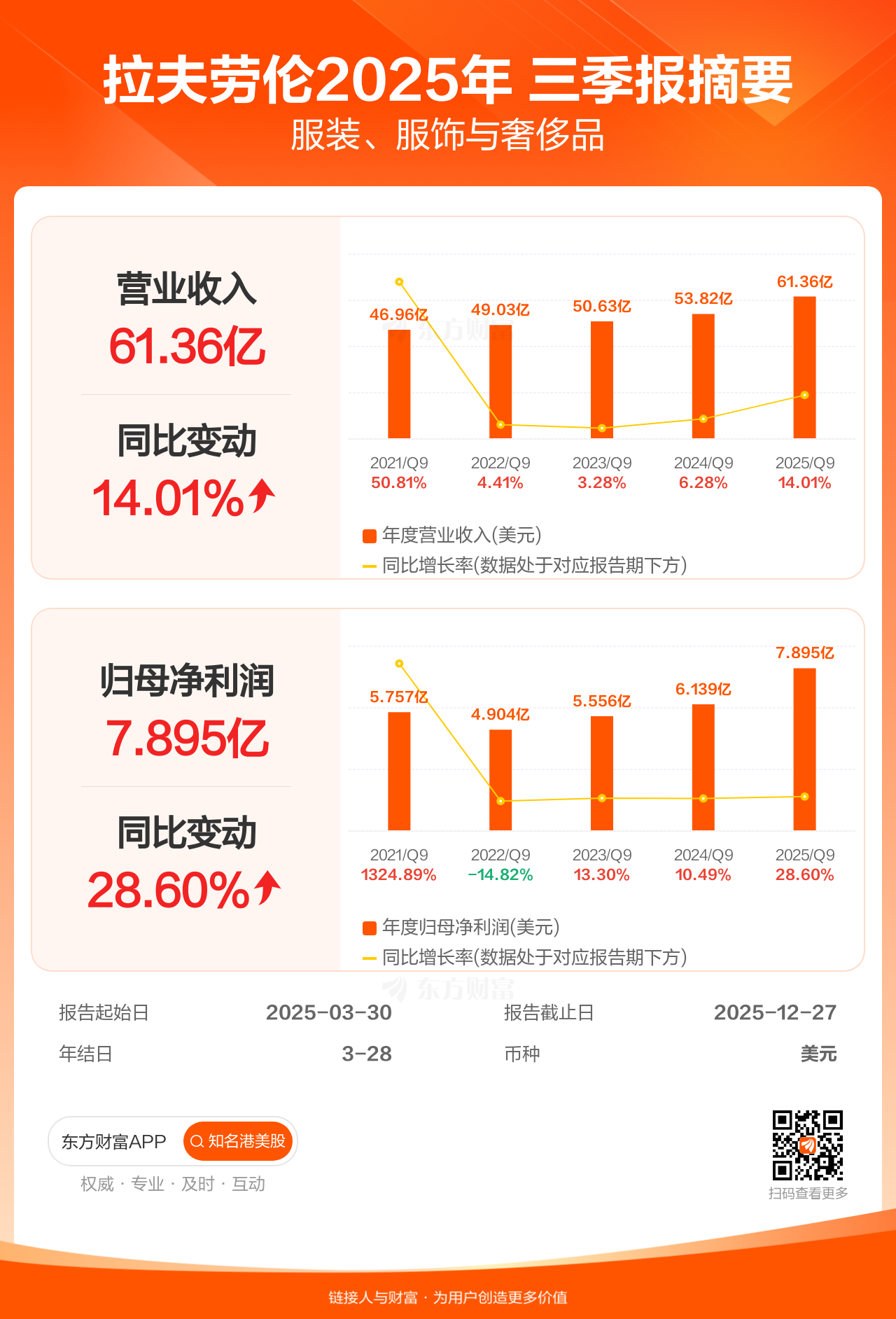 拉夫劳伦2月5日发布三季报业绩,截至2025年12月27日的9个月内,该公司营业收入61.36亿美元,同比增长14.01%;公司权益持有人应占溢利(归母净利润)7.90亿美元,同比增长28.60%。