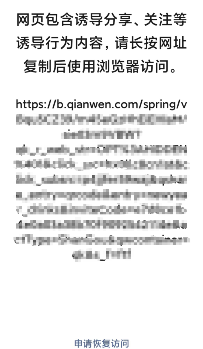 此后,微信也开启了“一视同仁”:千问的红包分享链接被微信屏蔽,页面显示网页存在诱导分享、关注等诱导行为内容,需要跳转第三方浏览器访问。