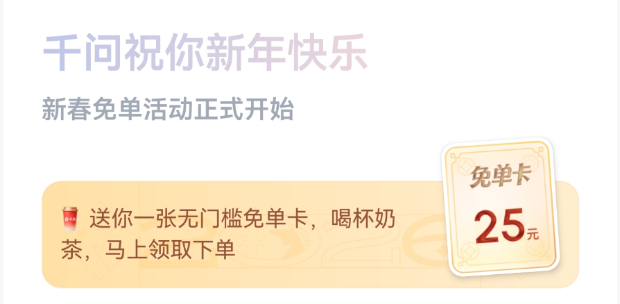 千问App活动页面显示,第一波免单活动时间为2月6日—2月12日。所有用户更新千问App后,都能白拿一张25元无门槛免单卡,不仅能免单喝奶茶,也能通过淘宝闪购买年货、点外卖。