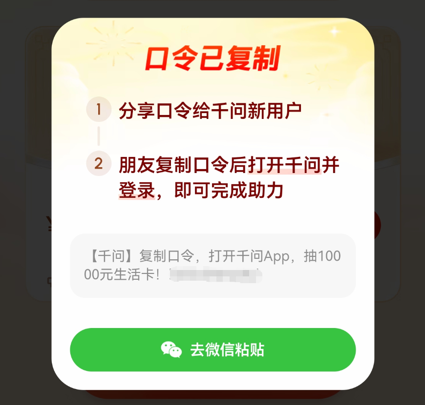 记者体验后发现,目前在千问App点击分享活动至微信好友时,已自动改为复制口令形式。