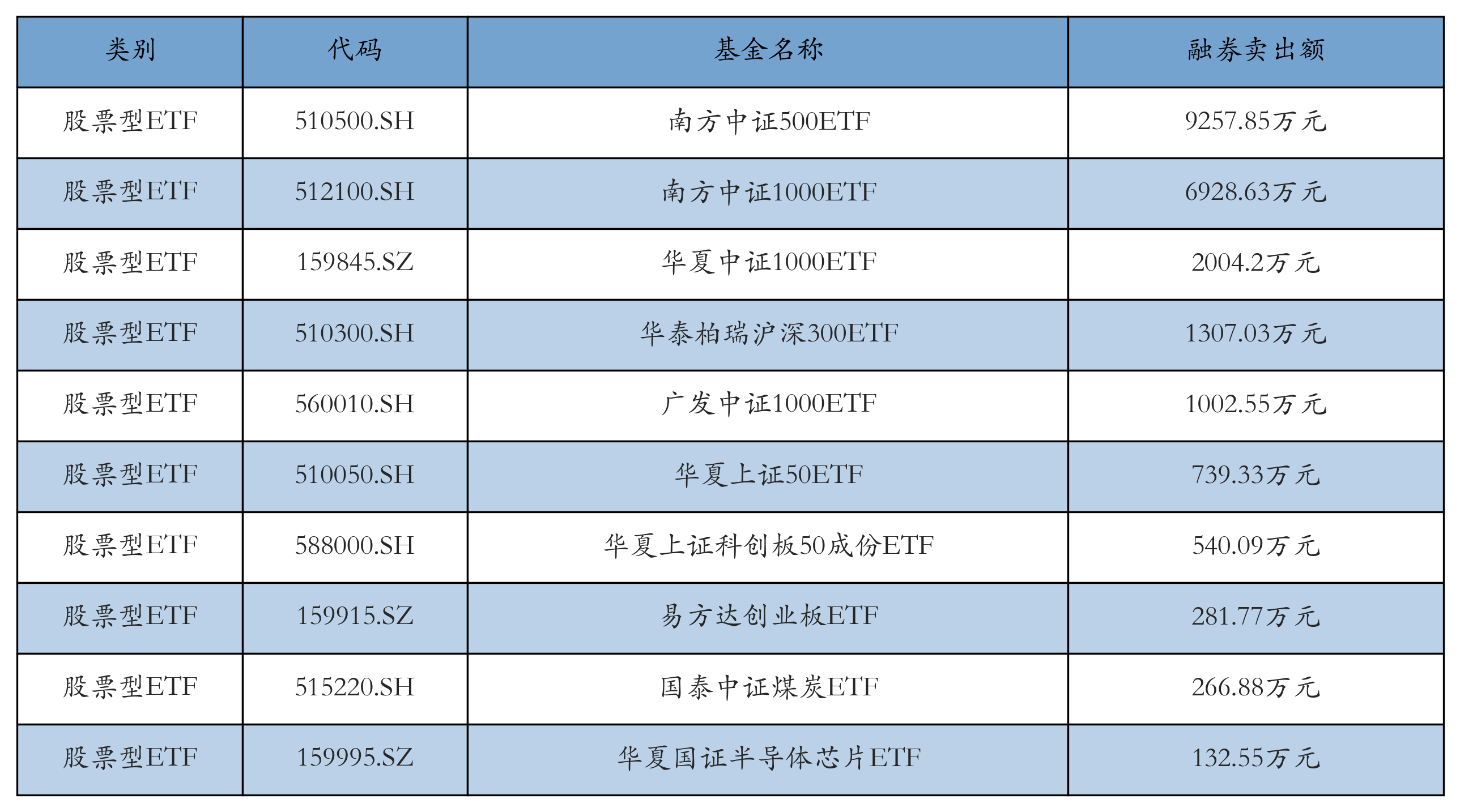 昨日股票型ETF融资卖出额最高的3只ETF及其卖出金额分别为:南方中证500ETF(9257.85万元)、南方中证1000ETF(6928.63万元)、华夏中证1000ETF(2004.2万元)。融券卖出额前10详情见下表: