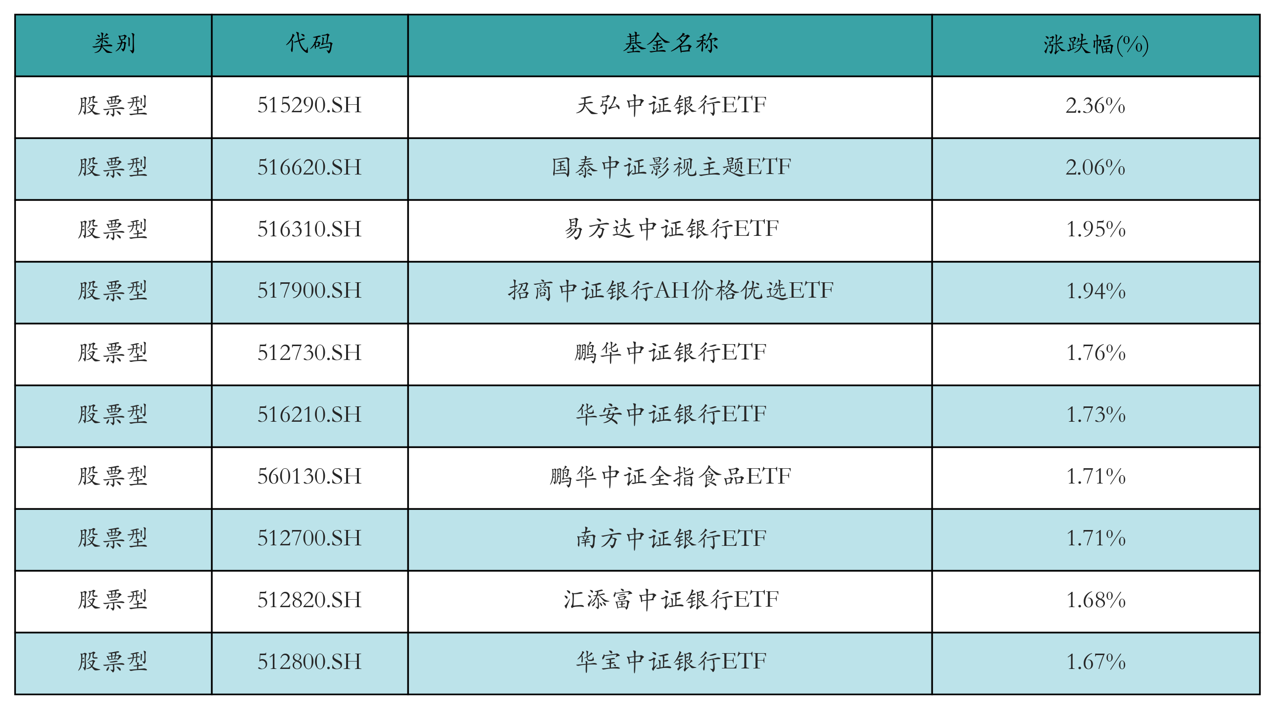 昨日股票型ETF涨幅最高的3只ETF及其收益率分别为:天弘中证银行ETF(2.36%)、国泰中证影视主题ETF(2.06%)、易方达中证银行ETF(1.95%)。涨幅前10详情见下表: