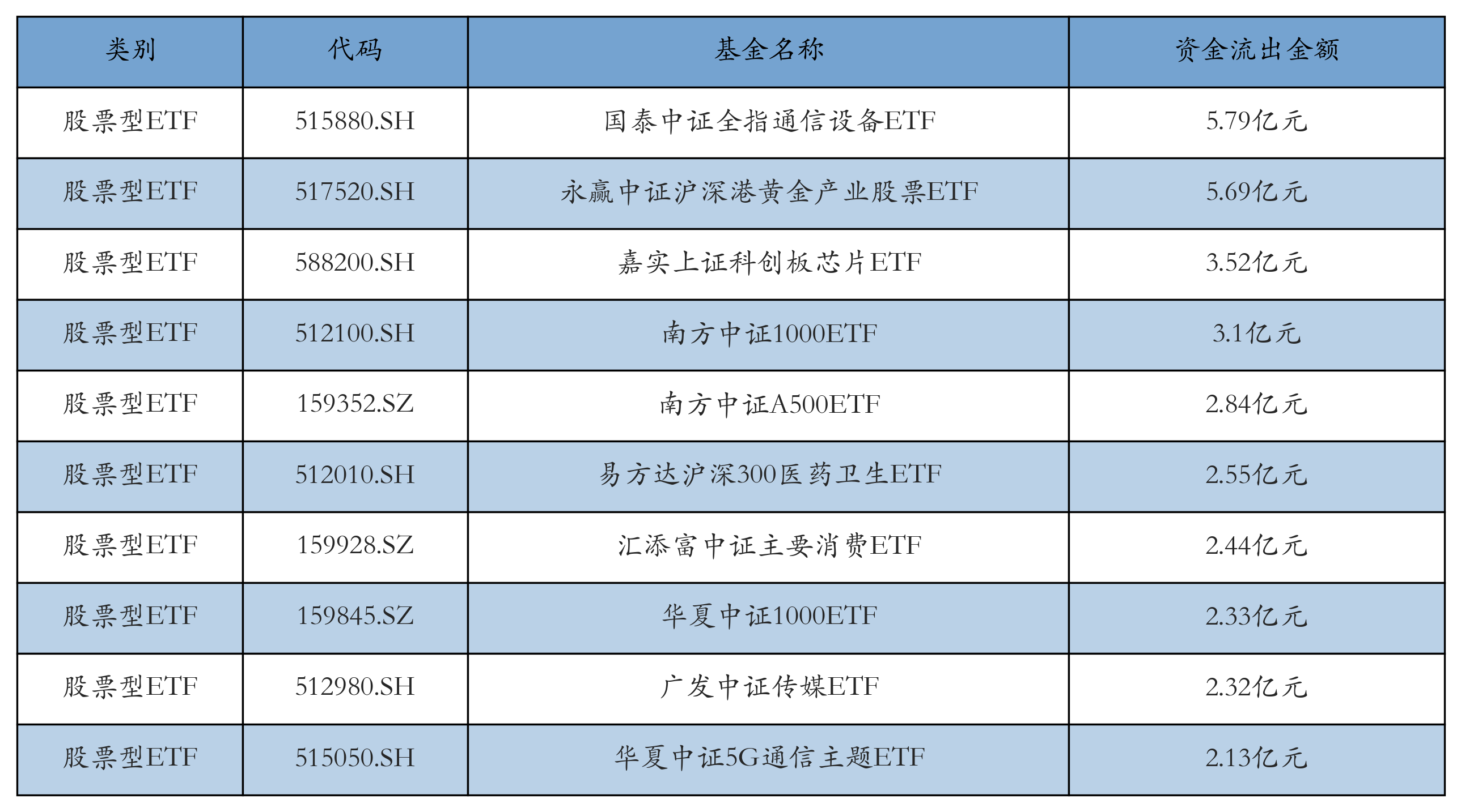 昨日股票型ETF资金流出最多的3只ETF及其流出金额分别为:国泰中证全指通信设备ETF(流出5.79亿元)、永赢中证沪深港黄金产业股票ETF(流出5.69亿元)、嘉实上证科创板芯片ETF(流出3.52亿元)。资金流出前10详情见下表: