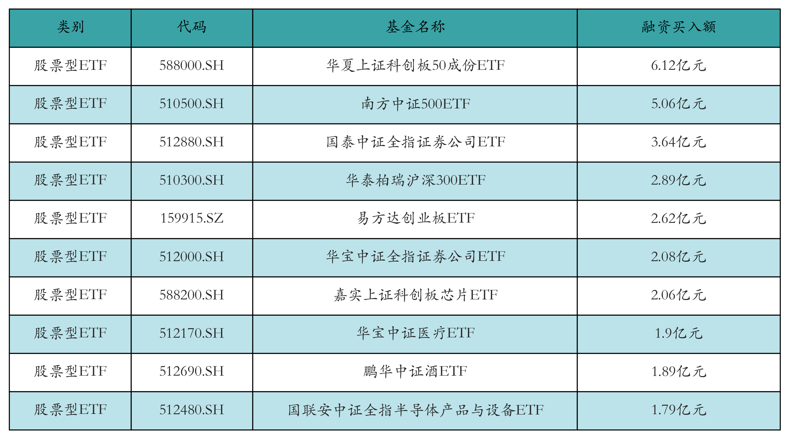 昨日股票型ETF融资买入额最高的3只ETF及其买入金额分别为:华夏上证科创板50成份ETF(6.12亿元)、南方中证500ETF(5.06亿元)、国泰中证全指证券公司ETF(3.64亿元)。融资买入额前10详情见下表: