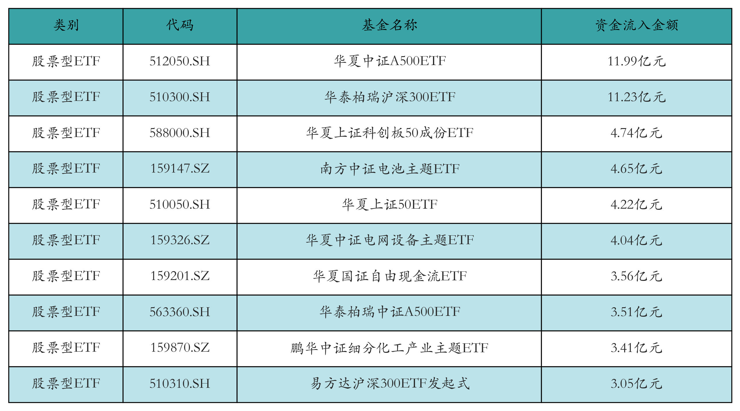 昨日股票型ETF资金流入最多的3只ETF及其流入金额分别为:华夏中证A500ETF(流入11.99亿元)、华泰柏瑞沪深300ETF(流入11.23亿元)、华夏上证科创板50成份ETF(流入4.74亿元)。资金流入前10详情见下表: