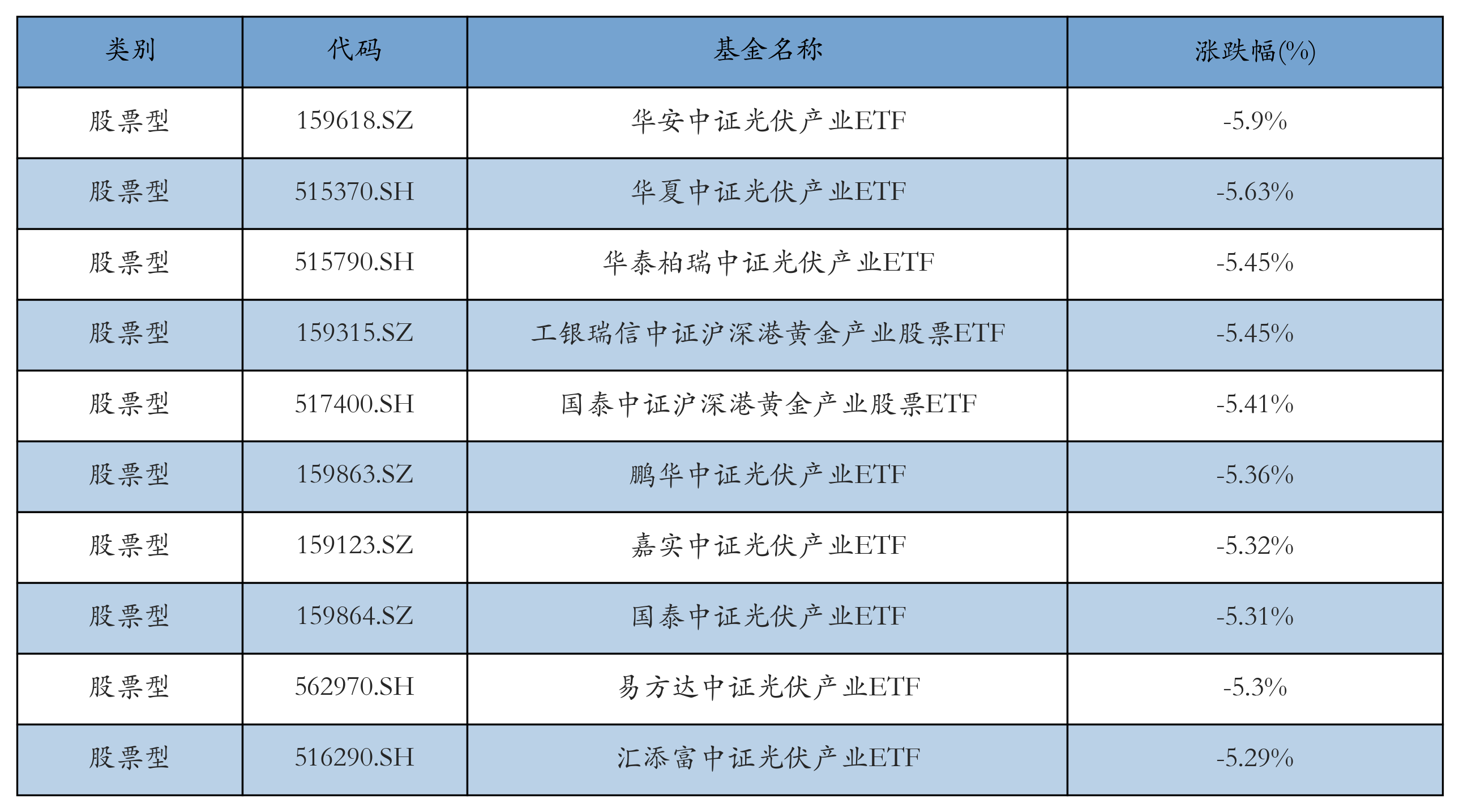 昨日股票型ETF跌幅最大的3只ETF及其收益率分别为:华安中证光伏产业ETF(-5.9%)、华夏中证光伏产业ETF(-5.63%)、华泰柏瑞中证光伏产业ETF(-5.45%)。跌幅前10详情见下表: