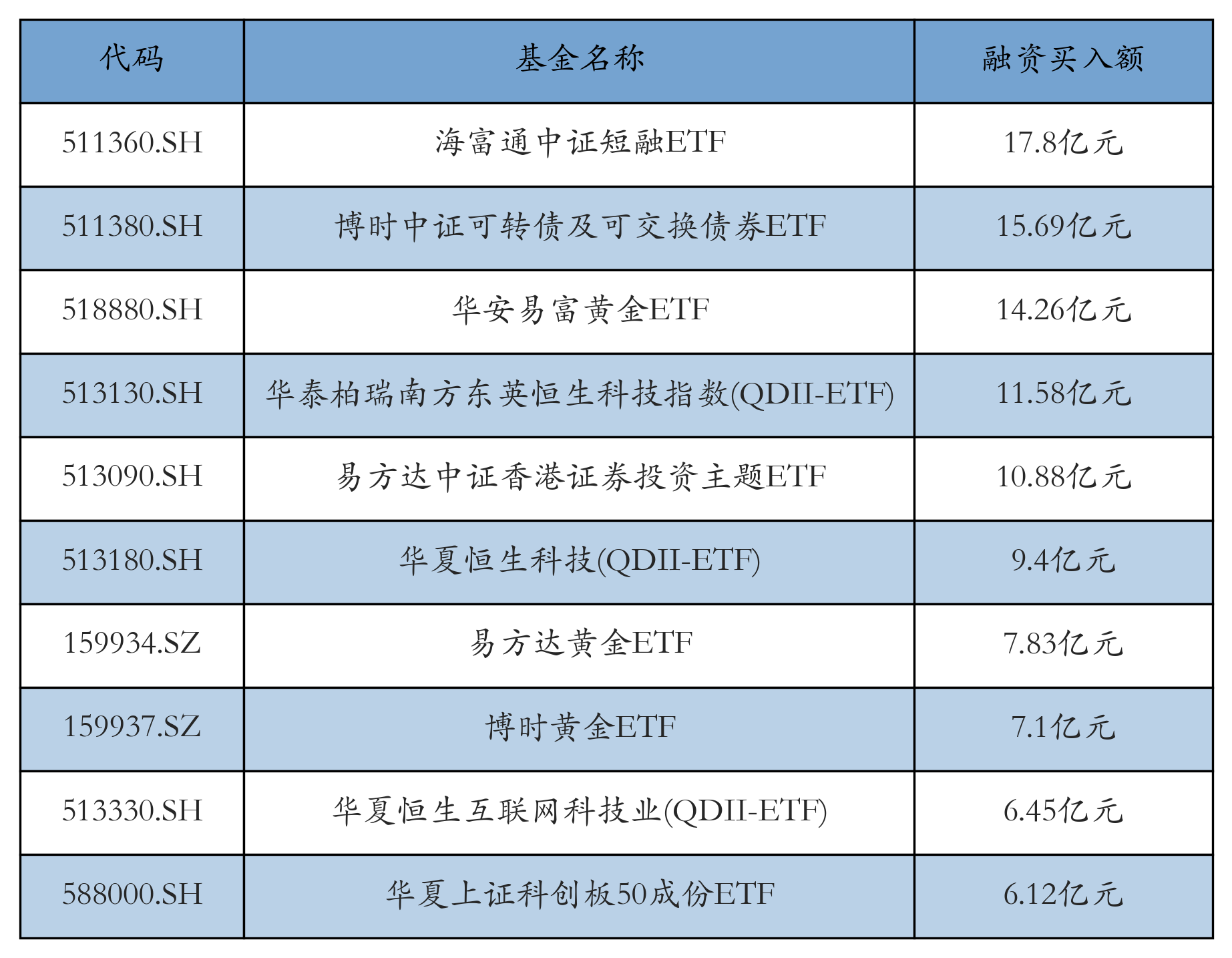2月5日ETF融资买入额前三位分别为:海富通中证短融ETF(17.8亿元)、博时中证可转债及可交换债券ETF(15.69亿元)和华安易富黄金ETF(14.26亿元),前10具体见下表: