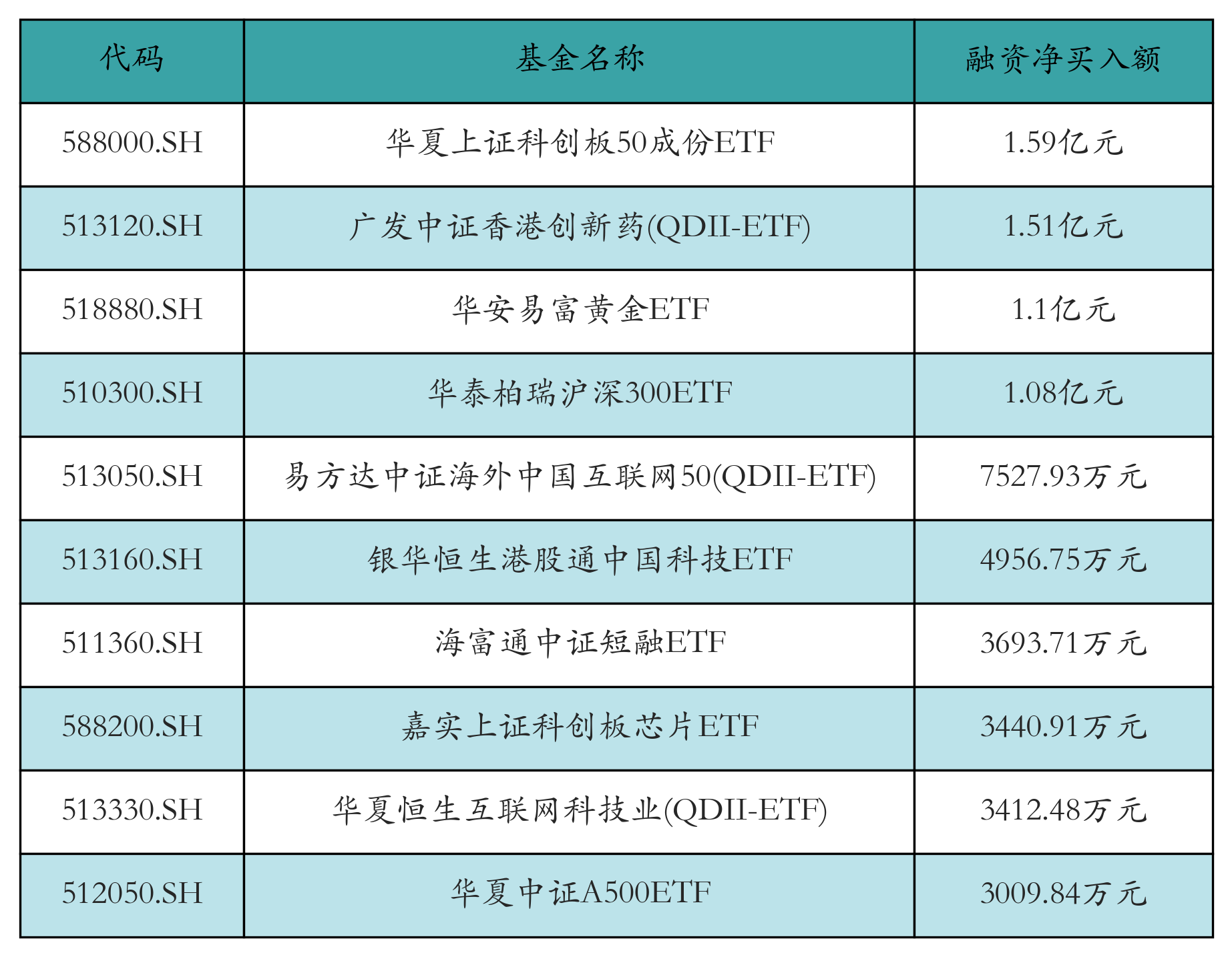 2月5日ETF融资净买入额前三位分别为:华夏上证科创板50成份ETF(1.59亿元)、广发中证香港创新药(QDII-ETF)(1.51亿元)和华安易富黄金ETF(1.1亿元),前10具体见下表: