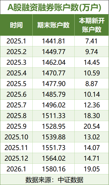 中证数据最新数据显示,2026年1月市场新开两融账户19.05万户,环比2025年12月(14.71万户)增长29.50%,同比2025年1月(7.41万户)增长157.09%。截至1月末,市场两融账户总数已达1580.16万户。