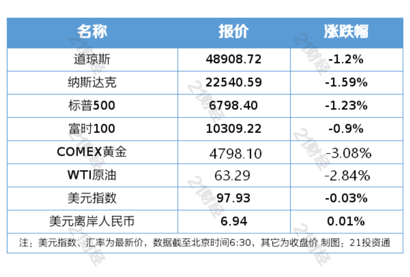 纽约股市三大股指2月5日下跌。截至当天收盘,道琼斯工业平均指数比前一交易日下跌592.58点,收于48908.72点,跌幅为1.20%;标准普尔500种股票指数下跌84.32点,收于6798.40点,跌幅为1.23%;纳斯达克综合指数下跌363.99点,收于22540.59点,跌幅为1.59%。