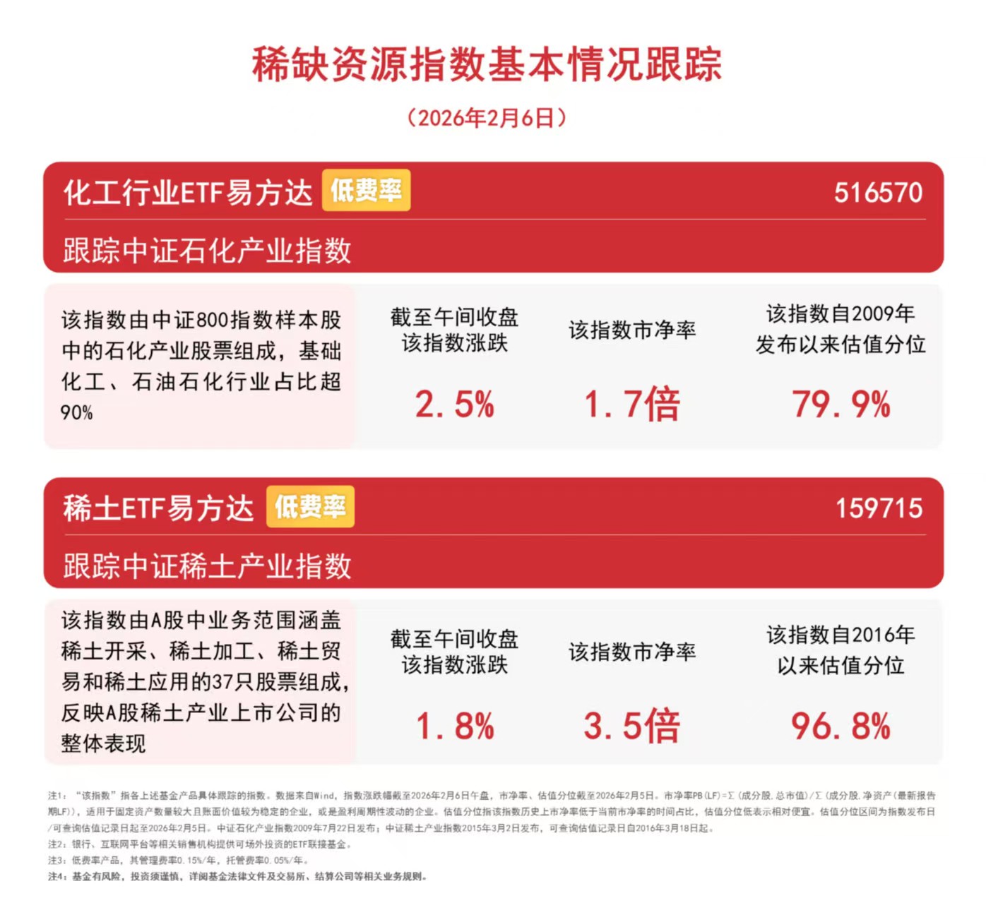 稀缺资源指数集体走强,关注化工行业ETF易方达(516570)、稀土ETF易方达(159715)等产品投资机会