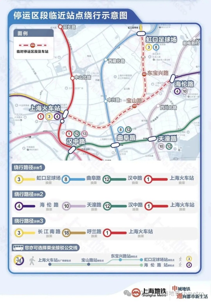 乘客也可通过轨道交通网络其他线路进行换乘绕行(详见下图),如:宝山路站以北的乘客,可在虹口足球场站乘坐8号线到曲阜路站,换乘12号线到汉中路站,再换乘1号线到达上海火车站站;也可在海伦路站乘坐10号线到天潼路站,换乘12号线到汉中路站,再换乘1号线到达上海火车站站;长江南路站以北的乘客,可在长江南路站乘坐18号线到呼兰路站,再换乘1号线到达上海火车站站。特别提醒大家:提前合理安排出行路径,选择适宜的交通方式。