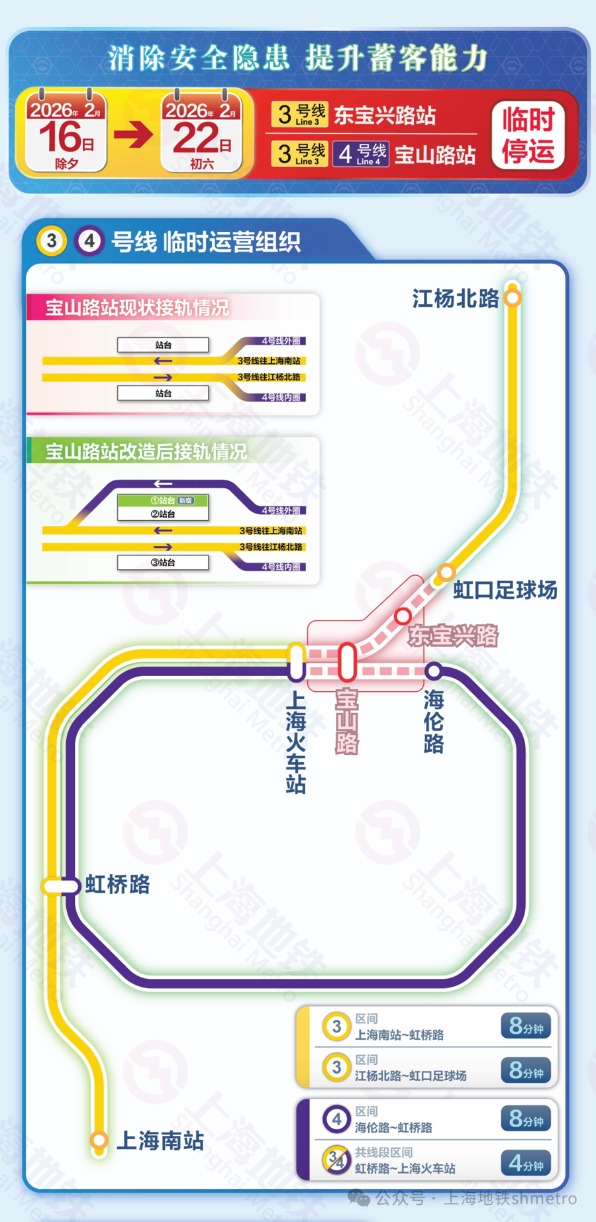 春节期间的2月16(除夕)日至22日(初六),上海地铁将利用全年客流低谷窗口期,对3/4号线宝山路站新增一条轨道和扩容站台,以消除共线段咽喉位置的安全隐患,提高蓄客能力,为未来增能创造条件。其间,3号线东宝兴路站、3/4号线宝山路站将暂停运营,3、4号线分别改为分段运营和C字形交路折返运营。停运区段由免费公交短驳替运。
