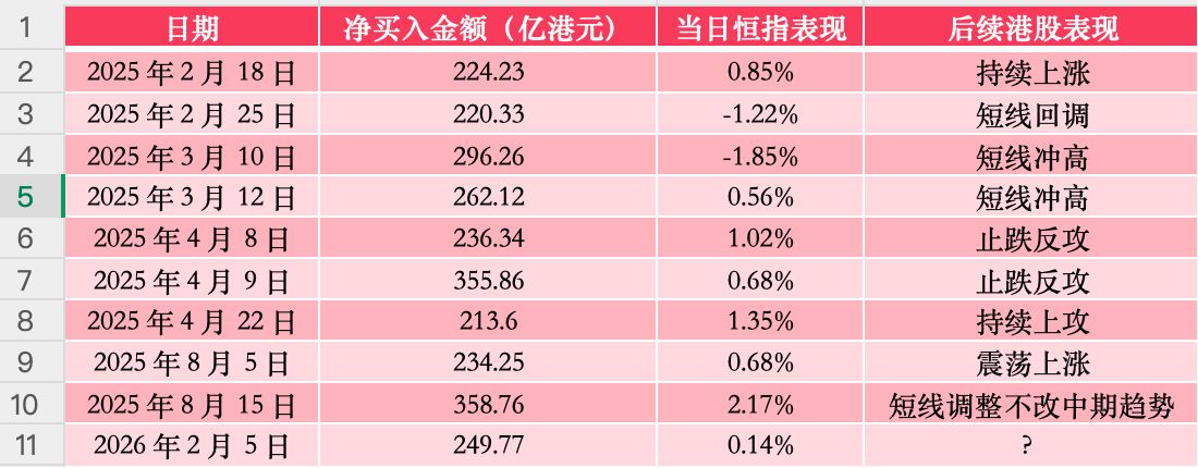 今天(2月6日),笔者对此进行了一个统计。2025年2月以来,南向资金刚好出现过10次净买入港股超过200亿港元的情况。统计后发现,每次南向资金爆量之后,港股上涨的胜率接近100%。