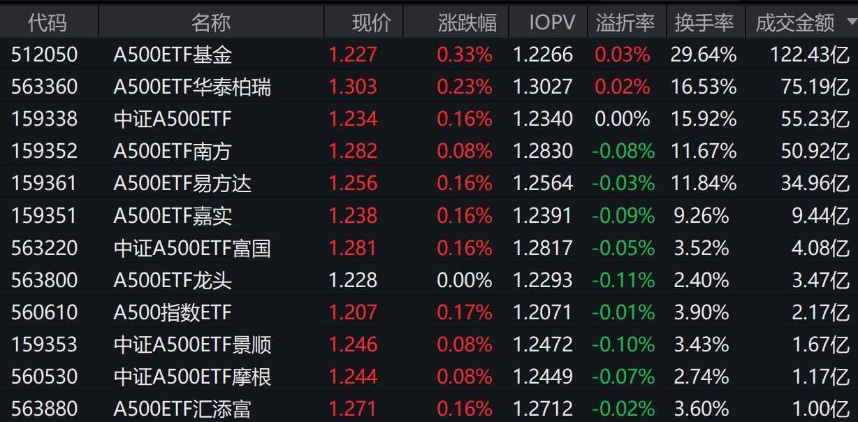 截至上午收盘,场内多只跟踪中证A500指数的ETF小幅上涨。其中,有12只中证A500相关ETF成交额超1亿元,2只超75亿元。A500ETF基金、A500ETF华泰柏瑞早盘成交额分别为122.43亿元、75.19亿元。