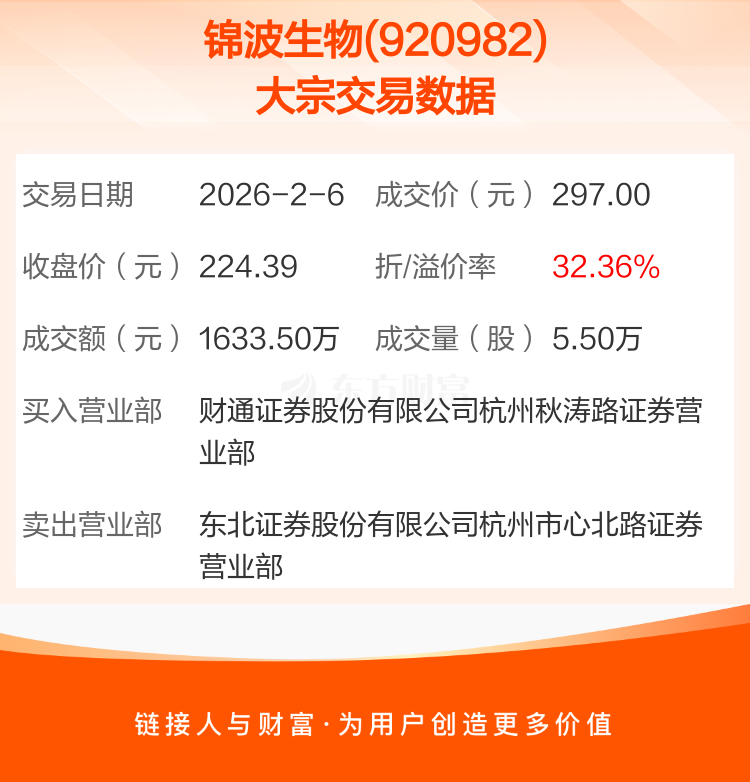 2026年2月6日,锦波生物发生1笔大宗交易,共成交5.50万股,成交金额1633.50万元,占其流通市值比例为0.13%。