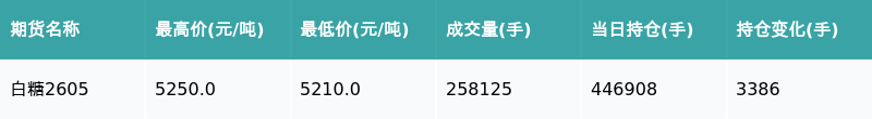 南财智讯2月6日电,盘后期货数据显示,郑州商品交易所的白糖主力合约收涨0.11%,收盘报5228.0元/吨,日内资金流入2337.13万元。其他相关指标见下表: