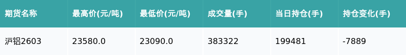 南财智讯2月6日电,盘后期货数据显示,上海期货交易所的沪铝主力合约收跌1.31%,收盘报23315.0元/吨,日内资金流出2.18亿元。其他相关指标见下表: