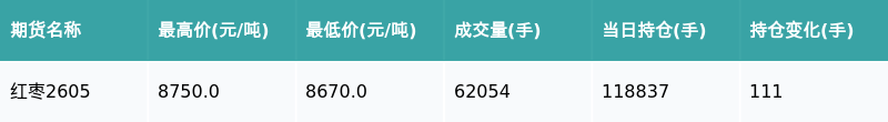 南财智讯2月6日电,盘后期货数据显示,郑州商品交易所的红枣主力合约收跌1.25%,收盘报8695.0元/吨,日内资金流出607.68万元。其他相关指标见下表: