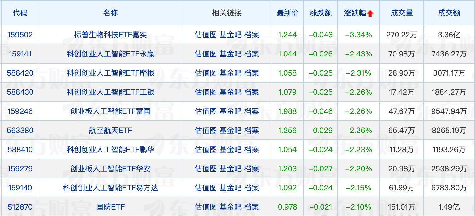 下跌方面,标普生物科技ETF嘉实领跌3.34%,多只科创创业人工智能ETF回调居前。