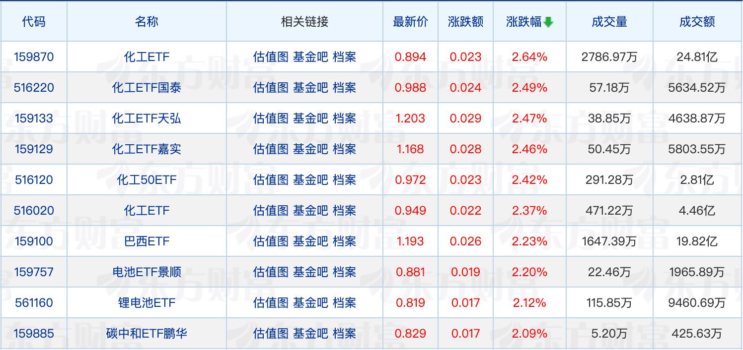 具体来看,化工板块集体走强,沧州大化、金牛化工、百川股份、百合花涨停,化工ETF集体走强,最大涨幅为2.64%。