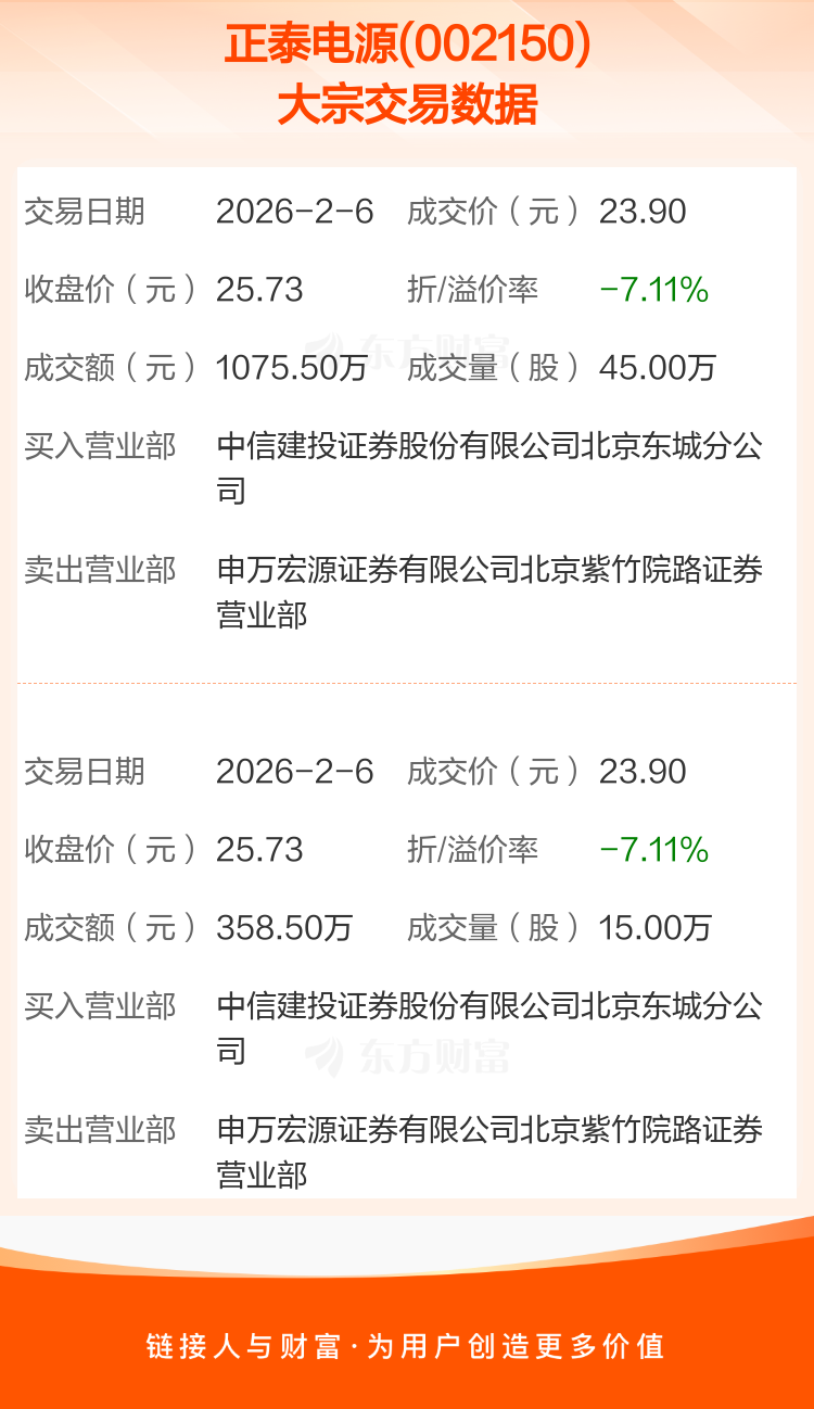 大宗交易:正泰电源成交1434.00万元,折价7.11%(2-6)